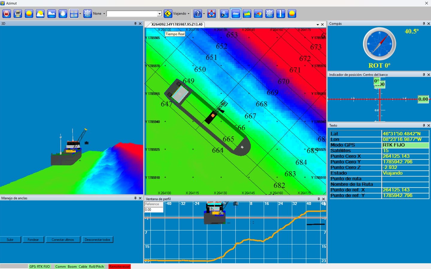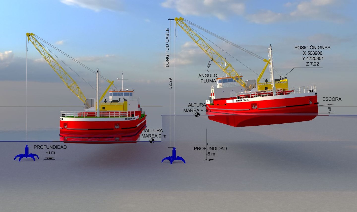 La plataforma de control integra todos los sistemas del buque y de la grúa, proporcionando una visión continua y precisa del proceso de dragado. El operador y el patrón disponen de información en tiempo real para controlar tanto la extracción de material como el relleno con la cuchara, permitiendo trabajar directamente sobre las cotas definidas en el proyecto. Cada vez que se extrae o se aporta material con la grúa, el software actualiza el modelo digital del terreno de forma inmediata, representando los cambios del fondo mediante una escala de colores. Esta funcionalidad permite, además de dragar, realizar enrases precisos ajustando el fondo a la cota deseada y verificando al instante el resultado del trabajo, lo que reduce sobre excavaciones, evita zonas sin ejecutar y mejora la calidad final de la obra.