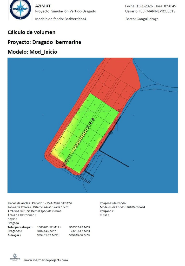 Mediante la configuración de una dirección de correo electrónico, el operador puede enviar, con un solo botón desde la interfaz, un informe en formato PDF que resume de forma clara y visual el estado de la obra. El informe incluye una imagen actualizada de la batimetría representada en escala de colores, así como el volumen dragado y el volumen pendiente de ejecutar.